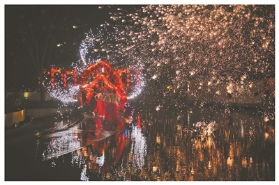 成都青羊区清源社区舞龙、打铁花表演。(成都市文明办供图)