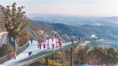 1月22日,雪后,在安徽省合肥市庐江县“庐南川藏线”矾山镇“六道拐”路段观景平台,游客在积雪上翩翩起舞,乐享冬日赏雪观景之妙趣。