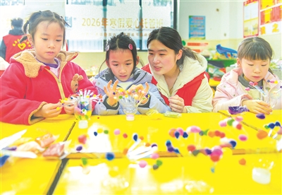 寒假期间,湖南省永州市道县开展“共青团·伙伴计划”寒假爱心托管项目,发动返乡大学生志愿者参与托管服务,面向网约车司机、外卖配送员等新就业群体劳动者子女,提供暖“新”看护服务,通过开设心理健康课、趣味手工等课程,让孩子们度过一个快乐寒假。图为1月28日,道县第四小学,志愿者和孩子们一起制作手工作品。蒋克青 摄