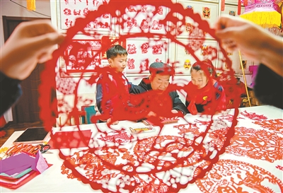 1月30日,安徽省含山县新时代文明实践中心组织孩子们走进市级非遗代表性传承人洪诗成工作室,开展非遗剪纸体验活动。孩子们跟随传承人学习折、剪、刻等剪纸技艺,感受传统工艺的独特魅力,丰富孩子们的假期生活。图为孩子们正在展示自己的学习成果。欧宗涛 摄
