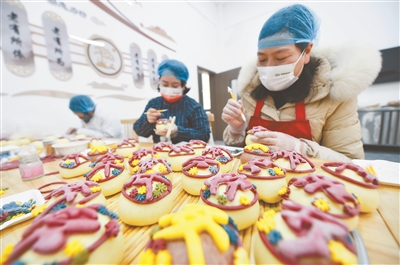 2月4日,河南省洛阳市西工区红山街道枣园社区花馍工坊内,工人们正忙着用杂粮和果蔬赶制造型各异、色彩缤纷的花馍,供应节日市场,为新春佳节增添喜庆气氛。