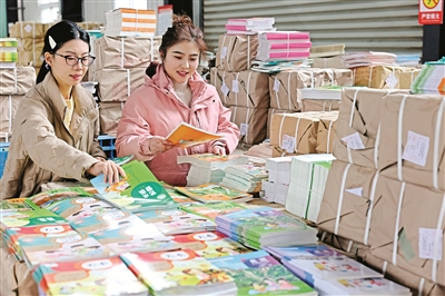 新学期开学临近,山东省枣庄市积极做好学生教材分类、配送、发放等工作,为开学做好准备。图为2月25日,在枣庄市新华书店教材发行中心,工作人员在清点整理新学期教材。