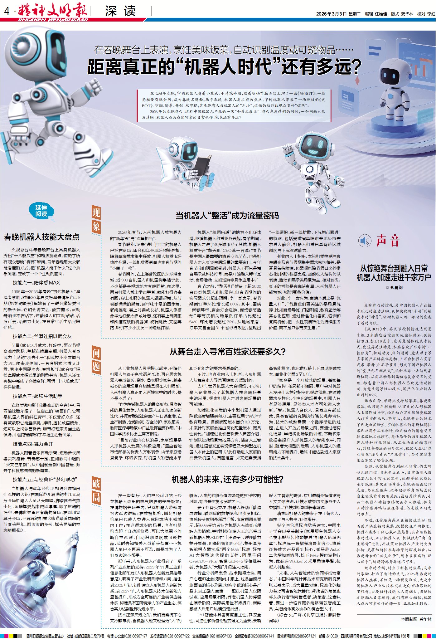 舞台之外,市场热度持续攀高。春晚刚落幕,银河通用标价近63万元的人形机器人上架即被抢空,松延动力万元级消费机器人订单排起长队。事实上,春晚舞台的技术早已走出实验室:宇树机器人的集群协同技术已应用于工业制造,松延动力的情感交互技术落地文旅演艺,魔法原子的四足机器人进入特种作业领域。从工业场景的精准作业,到服务领域的初步试水,机器人正从“舞台明星”逐步走向“产业骨干”,为走进日常生活奠定了坚实基础。