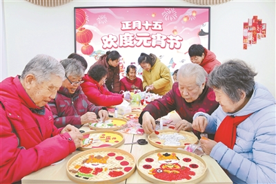 3月3日,江苏省连云港市连云区墟沟街道西园社区举办“银龄闹元宵 巧手迎福来”主题活动。图为参加活动的老年人在制作五谷杂粮吉祥画。朱华南 侍晓婷 摄