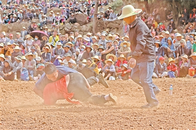 近日,有着700余年历史的云南省弥勒市西三镇腻黑村热闹非凡。这个被列入第一批中国传统村落名录的彝族村寨举办彝族摔跤运动会,吸引万余名游客和群众在赏摔跤、品美食、跳月狂欢中体验浓郁的民族风情。图为彝族摔跤运动会比赛现场。 赵树龙 摄