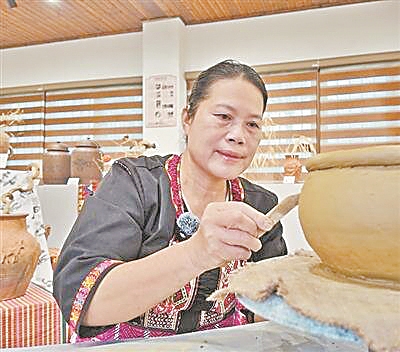 一块黏土在木案上被反复揉捏、盘打,逐渐变得柔韧。工作台前,刘梅珍专注地捏制陶器。她笑着给笔者递过来一团陶泥:“试试看,感受一下陶泥的手感。”陶泥在手中湿润而厚重,这是海南昌江黎族自治县保突村特有的高岭土,黏性好,耐高温。