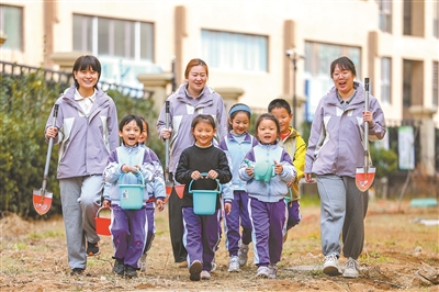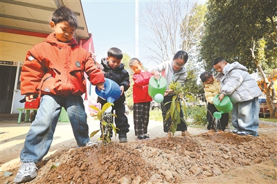 3月11日,在浙江省湖州市吴兴区埭溪镇中心幼儿园,小朋友和老师一起给刚栽种的树苗浇水。何伟卫 摄