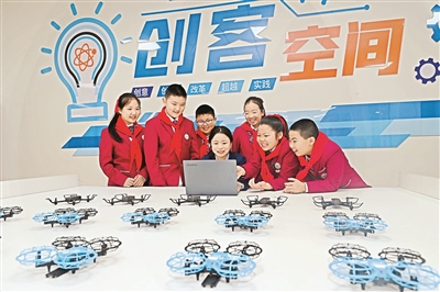 近年来,四川省内江市东兴区外国语小学在校园设立“创客空间”,组建无人机科创小组,每周开展无人机编程、操控培训,培养学生的创新思维与动手能力。图为3月23日,学生在老师指导下学习无人机相关技术。兰自涛 摄