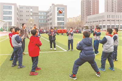 3月5日,山东淄川经济开发区实验学校的操场上,小学生们利用大课间开展 “同心击鼓” 趣味运动。翟慎安 尚小茹 摄