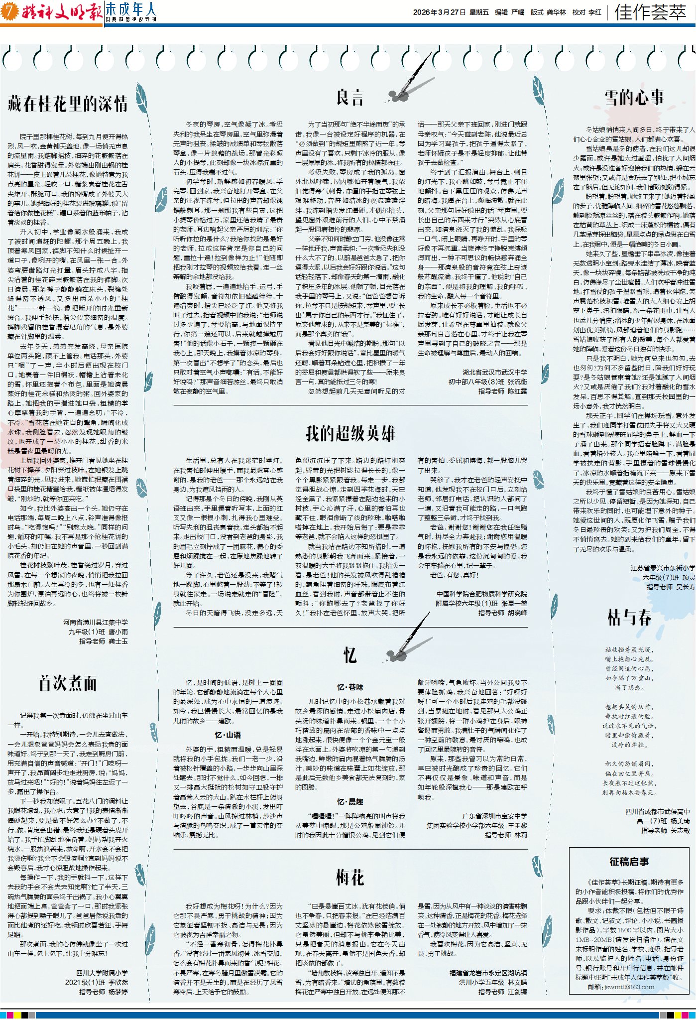 要求:体裁不限(包括但不限于诗歌、散文、记叙文、评论、小小说、书画摄影作品),字数1500字以内,图片大小1MB~20MB(请发送扫描件)。请在文末标明作者的姓名、学校、班级、指导老师,以及监护人的姓名、电话、身份证号、银行账号和开户行信息,并在邮件标题中注明“未成年人佳作荟萃版”收。