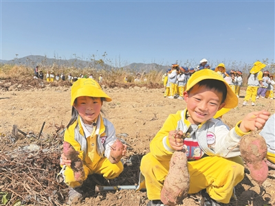 近日,云南省大理市凤仪镇各学校、幼儿园组织师生开展春季研学活动,将课堂搬进大自然,通过徒步参观、种植采摘、趣味游戏等多样化实践活动,丰富学生生活体验,拓展自然认知能力。图为3月27日,凤仪镇德尚幼儿园的小朋友在研学基地挖红薯。杨进军 摄