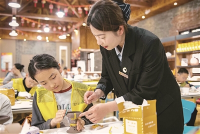 4月2日,安徽省含山县凌家滩国家考古遗址公园迎来学生研学实践活动。小学生们在讲解员带领下,参观遗址博物馆、观看4D电影,参与考古现场模拟发掘、模拟文物修复等体验活动,在实践中拓宽眼界、增长见识。图为学生正在现场模拟文物修复。欧宗涛 摄