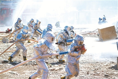 烈日下的消防比武。