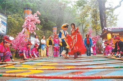 广西“三月三”小长假期间,来宾市金秀瑶族自治县举办跳竹竿舞、抛绣球等丰富多彩的民俗文化活动,吸引众多游客前来感受民俗文化魅力。图为4月17日,游客在大瑶山盘王界景区体验跳竹竿舞。高如金 摄