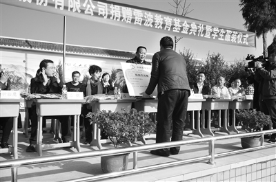 十多年来,成都红石榴农业开发股份有限公司始终秉承企业效益与社会效益共同提升的发展理念,面向社会奉献爱心,每销售一瓶五粮液红石榴酒就提取一元钱作为爱心基金,每年年底都会将这份爱心基金捐献给四川省凉山州的教育事业。图为近日在雷波县溪洛米乡中心校,公司向雷波县教育基金捐款50万元。 渔歌 摄