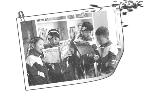 学生们在班级图书角边读书边交流有关清明节的知识