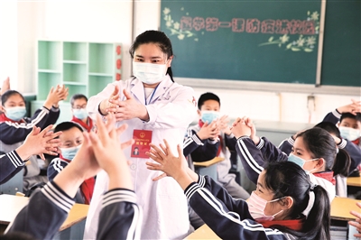 4月20日是浙江省小学四到六年级复学第一天,德清县乾元镇人大开展“复学第一课 防疫进校园”活动,组织人大代表为孩子们讲解防疫知识,为健康校园保驾护航。图为乾元镇人大代表、医生胡璇雯在镇中心小学向学生讲解七步洗手法、正确佩戴口罩等防疫知识。张燕 小绍兴 摄