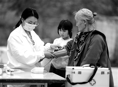 连日来,贵州省黔西市素朴镇家庭医生开展进乡村服务活动,镇卫生院家庭签约医生走进全镇20个村(社区)的田间地头、农户家中,为群众送医送药。图为9月27日,家庭医生在百花村给村民检查身体。周训超 摄