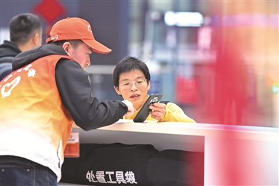 2月2日,大学生志愿者在重庆西站为乘客提供志愿服务。康平 摄